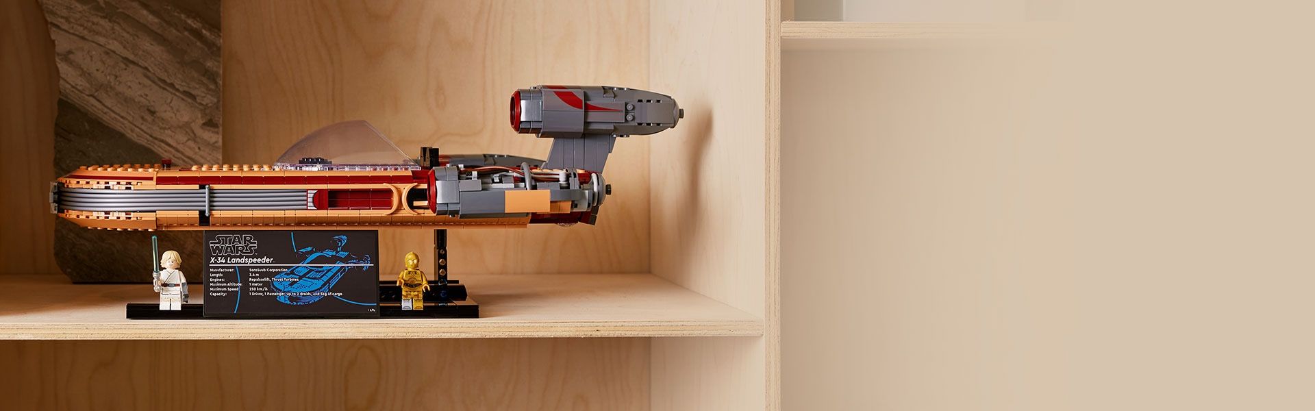 Sestavitelný model měří přes 49 cm na délku a jeho součástí je podstavec na vystavení s efektem vznášení. Dále nechybí cedulka s technickými údaji o pozemním spídru X-34 a 2 minifigurky LEGO: Luke Skywalker se světelným mečem a elektro-dalekohledem a C-3PO s dekorativními prvky, které představují novinku pro květen 2022.